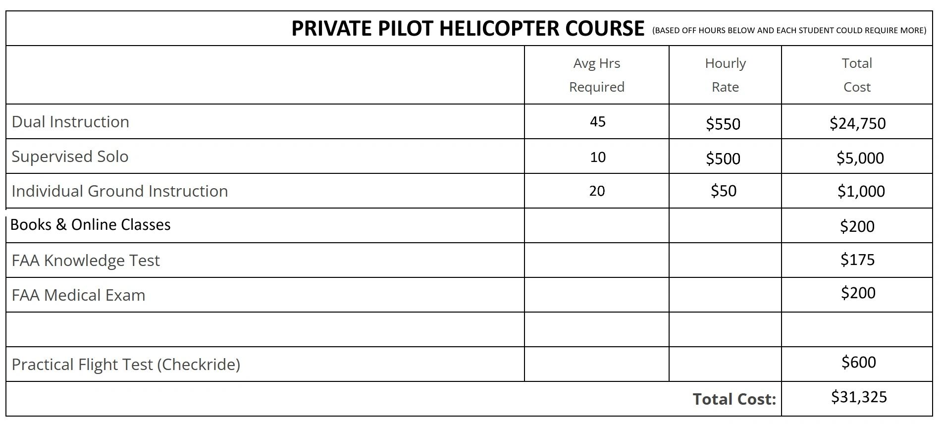 Please note: The "Average Hours Required" and "Total Cost" estimates provided are not based on the FAA's minimum hours needed to complete these ratings. Instead, they reflect the average hours typically required. While some individuals may finish training in the minimum time, most need slightly more to fully develop the skills necessary to pass the FAA flight tests. Our estimates are honest, realistic, and informed by over 15 years of helicopter pilot training experience. The actual time and cost for each person will vary depending on their individual abilities, effort, motivation, and dedication. Feel free to contact us with any questions about the training process.